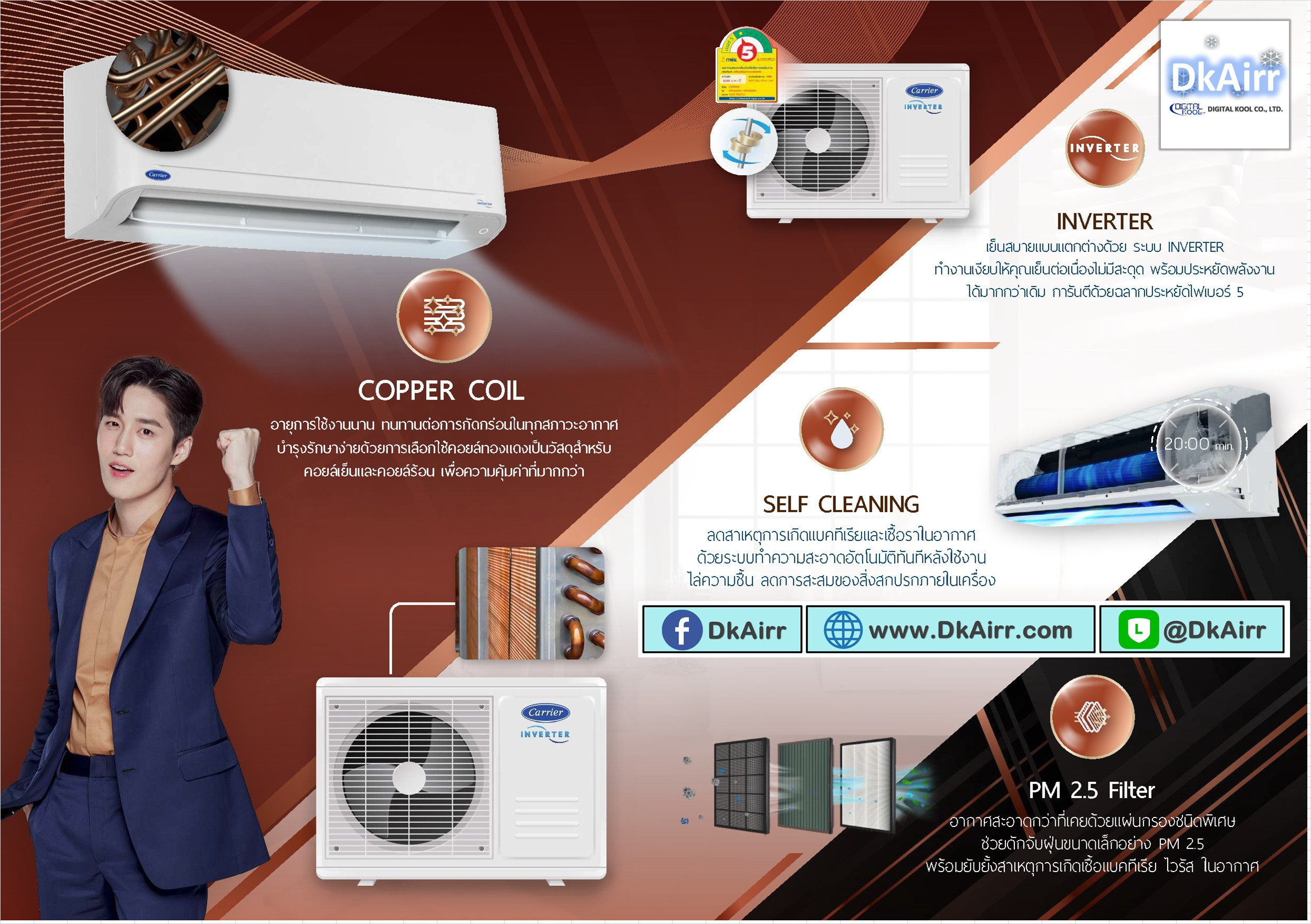 CARRIER (แคเรียร์) แบรนด์แอร์ระดับโลกจากอเมริกา ยังคงครองตลาดในปี 2025 ด้วยจุดเด่นเรื่อง “เย็นเร็ว ประหยัดไฟ เงียบ ทนทาน” รุ่นขายดีปีนี้ เช่น CARRIER X-Inverter Plus ที่มาพร้อมระบบ PM2.5 Filter ดักฝุ่นละเอียด และ CARRIER Copper 11 Inverter ที่ใช้ท่อทองแดงทั้งระบบ เพิ่มอายุการใช้งาน แถมยังมีฟังก์ชัน Eco Sleep ช่วยประหยัดไฟอัตโนมัติสำหรับคนพักคอนโด